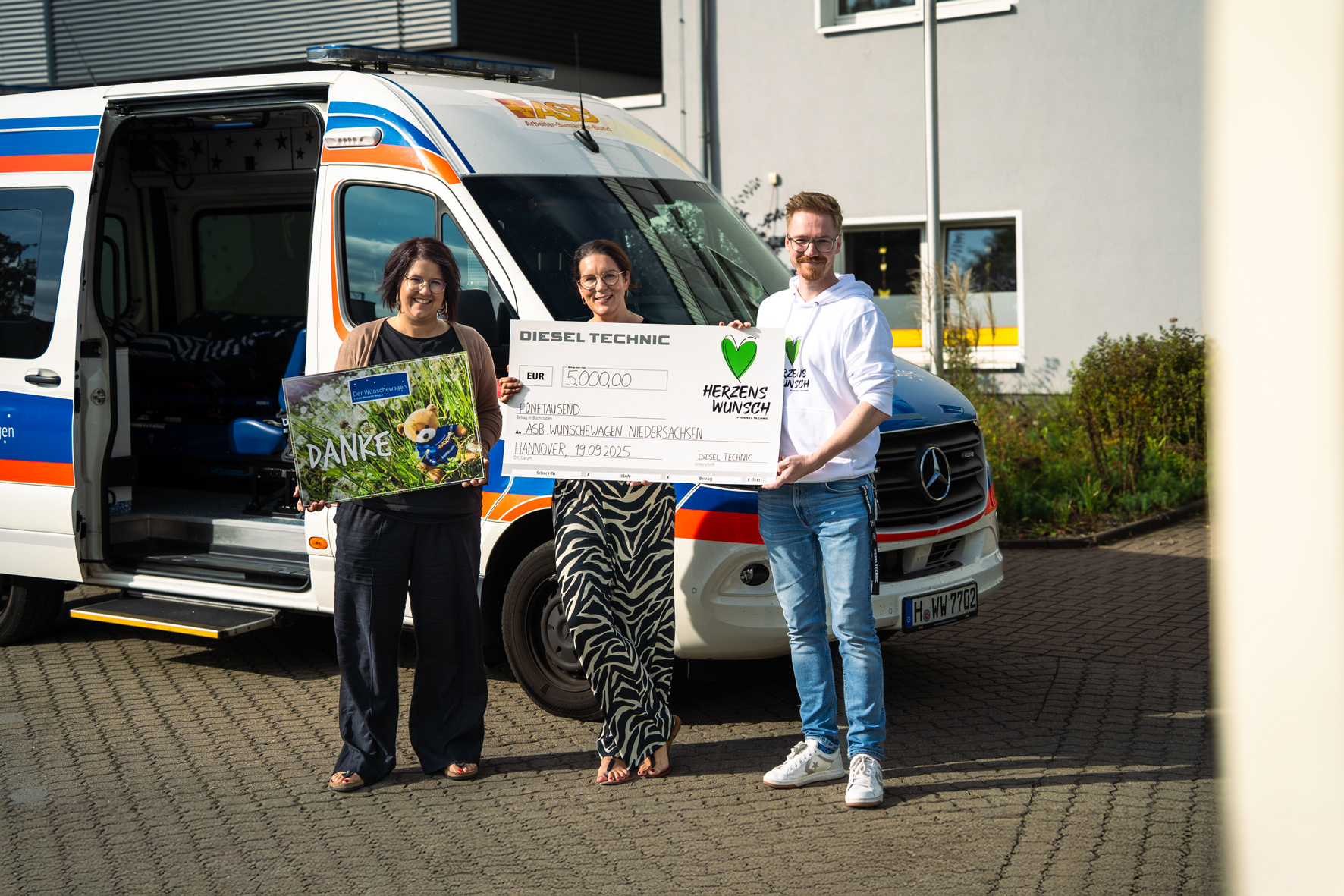 Im Rahmen des Charity-Programms „Herzenswunsch“ engagiert sich Diesel Technic für Herzensangelegenheiten seiner Mitarbeitenden. Dabei können alle Beschäftigten Projekte vorschlagen, die ihnen besonders am Herzen liegen. Einer dieser Wünsche stammt von Oliver Brockmann, Gruppenleiter Content Creation bei Diesel Technic: die Förderung des ASB-Wünschewagen Niedersachsen. Dieses Projekt erfüllt Menschen in ihrer letzten Lebensphase einen besonderen Wunsch. Mit einer Spende von 5.000 Euro unterstützt Diesel Technic dieses wichtige Vorhaben und hilft dabei, schwerstkranken Menschen eine letzte Reise an ihren Lieblingsort zu ermöglichen.